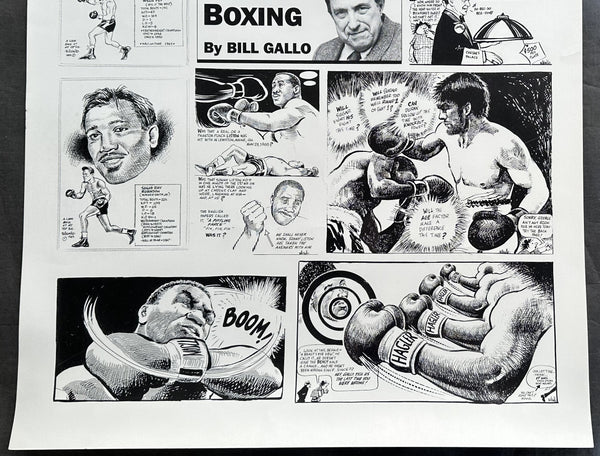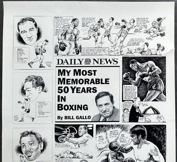 Offered here is a boxing poster which features Bill Gallo's Most Memorable 50 Years In Boxing. Includes Marciano, Tyson, Duran, Louis. Pep, Robinson, Ali, Frazier, Hagler and Liston.