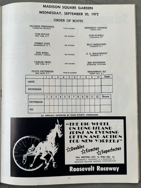 HISTORY: On September 20, 1972 at Madison Square Garden in New York Muhammad Ali defended his NABF Title against former heavyweight champion Floyd Patterson. Ali stopped Patterson in the 7th round. Offered here is an original, official program for this event.