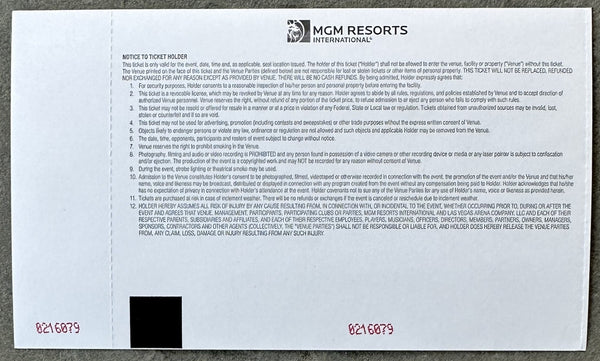 FULL DESCRIPTION: This is an original, on site, full, unused weigh-in ticket which names both fighters. Stub firmly attached. Clean front and back. Bold color and print. Not creased or torn. 3 1/4" x 5 1/2."