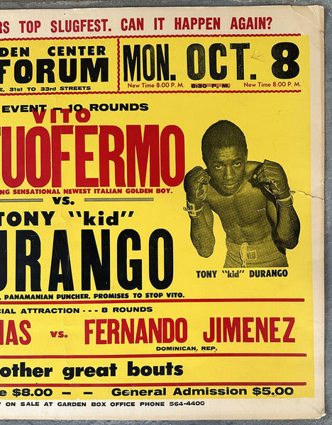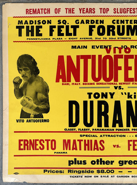 FULL DESCRIPTION: This is an original, cardboard on site poster which names and pictures both fighters. Bold color and print. Bold, clear images including a young Vito Antuofermo. Poster is clean front and back without staining. Has a mild center crease. Small creases at upper right and left corners. Small tack holes. Edge and corner with three closed tears with no paper loss. 22" x 28."
