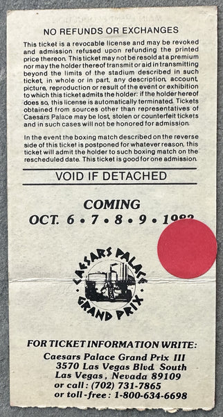 FULL DESCRIPTION: This is an original, on site stubless ticket which names and pictures the fighters and includes a section, row and seat number. Bold color and print. Bold, clear images. Has a mild crease. No tears. Clean front and back. 2 1/2" x 5."