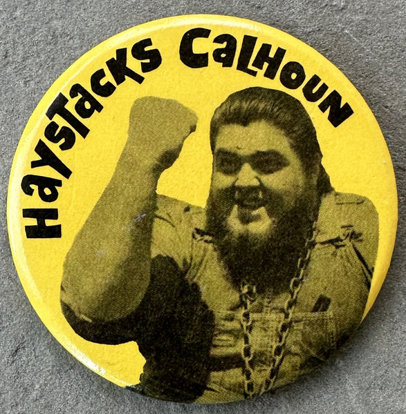 FULL DESCRIPTION: This is an original, metallic pin naming and picturing Haystacks Calhoun. Bold color and clear image. Pin firmly affixed to reverse. Clean without staining. Not scratched or dented. No rust. 3" in diameter.