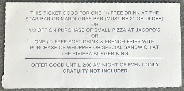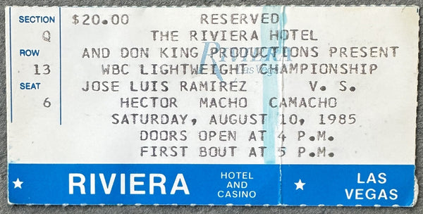 HISTORY: On August 10, 1985 at the Riviera Hotel in Las Vegas world lightweight champion Jose Luis Ramirez defended his title against undefeated Hector "Macho" Camacho. Camacho won the title by taking a 12 round unanimous decision over Ramirez. Offered here is an original, on site stubless ticket for this event.