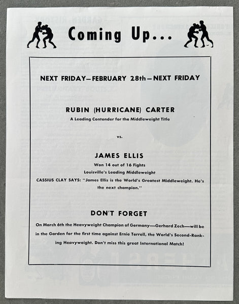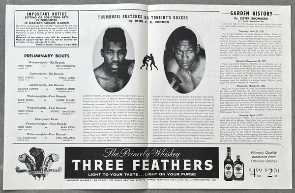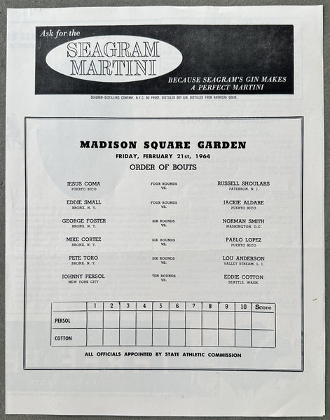 HISTORY: On February 21, 1964 at Madison Square Garden in New York light heavyweights Eddie Cotton and Johnny Persol fought in the main event. Persol prevailed winning a close 10 round split decision. "His youthful exuberance stood Johnny Persol in good stead in his fight with the veteran Eddie Cotton at MSG Friday night. Knocked through the ropes for a count of seven in the 6th round, the 23 year old New Yorker bounced back and gained a split 10 round decision in the nationally televised scrap. It was a disappointment for the 37 year old Cotton from Seattle, the No. 1 light heavyweight contender who was making his Garden debut after 16 years as a pro." -Associated Press.