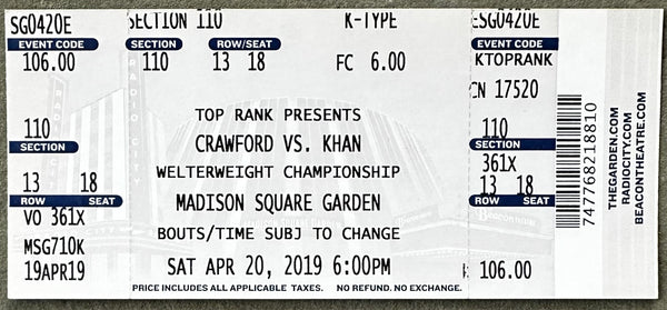 HISTORY: On April 20, 2019 at Madison Square Garden in New York WBO world welterweight champion Terence Crawford defended his title against Amir Khan in the featured bout. Crawford stopped Khan in the 6th round. Khan was down in round one.