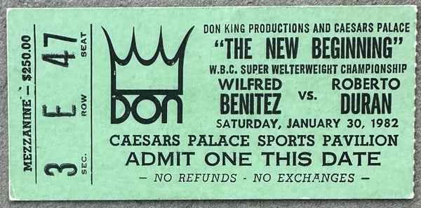 HISTORY: Roberto Duran fought Wilfred Benitez on January 30, 1982 at Caesars Palace in Las Vegas for the Super Welterweight Title. Duran lost the decision after 15 rounds. Offered here is an original, stubless ticket for this event.