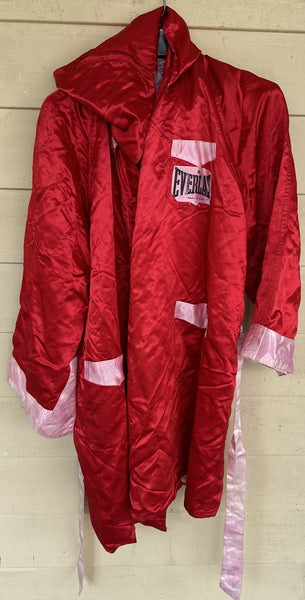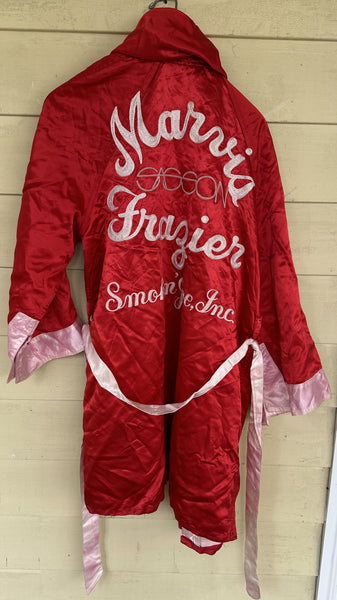 FULL DESCRIPTION: This is the actual fight worn robe used by Marvis Frazier in his first two professional fights. The robe has been photo matched to video of Frazier wearing the robe in the ring during his first two professional fights. Has a hood. Has a white sash. Everlast label on left breast. On the back in white script lettering are sewn the words, "Marvis sasson Frazier Smokin Joe, Inc." N tears. Well worn. Approximately thigh length.