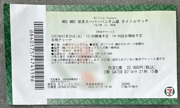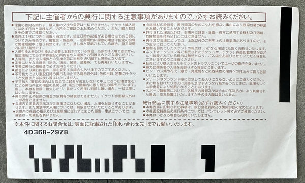 FULL DESCRIPTION: This is an original, on site, stubless ticket all in Japanese which includes a section, row and seat number. Bold color and print. Not creased or torn. Clean front and back. 3" x 5."