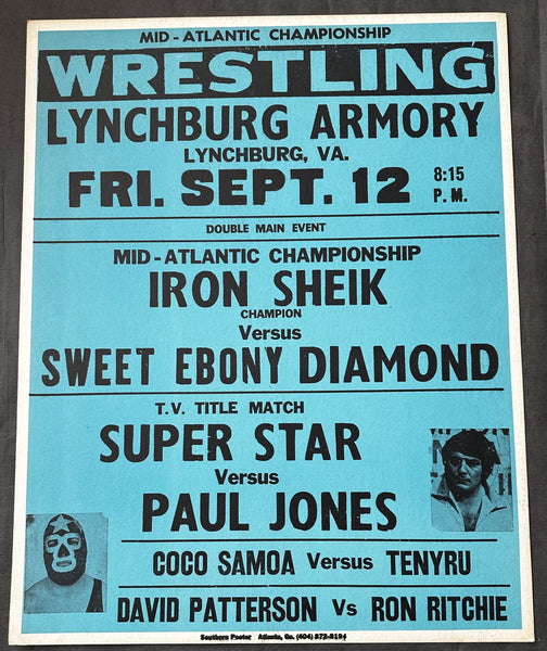 HISTORY: On September 12, 1980 at the Lynchburg Armory in Lynchburg, Virginia the Iron Sheik wrestled Sweet Ebony Diamond in the co feature on the show. In the other co feature Paul Jones wrestled The Masked Super Star.