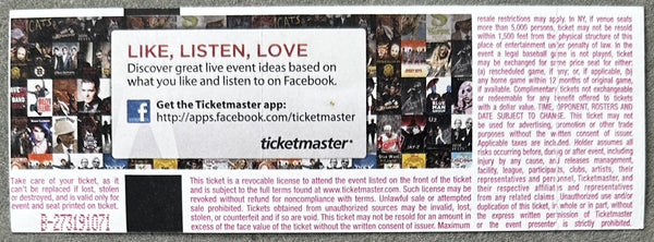 FULL DESCRIPTION: This is an original, on site, full, unused ticket which names the date and venue and which includes a section, row and seat number. Bold color and print. Clean front and back. Stub firmly attached. Not creased or torn. 2" x 5 1/2."