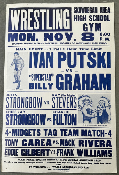 HISTORY: On November 8, 1982 at Skowhegan Area High School in Skowhegan, Maine Ivan Putski and "Superstar" Billy Graham headlined the wrestling show. Putski prevailed defeating Graham. Also on the show Ray Stevens defeated Jules Strongbow, Chief Jay Strongbow defeated Charlie Fulton and in a midget tag team match Little Beaver and Sonny Boy Blue defeated Sky Low Low and Butch Cassidy.
