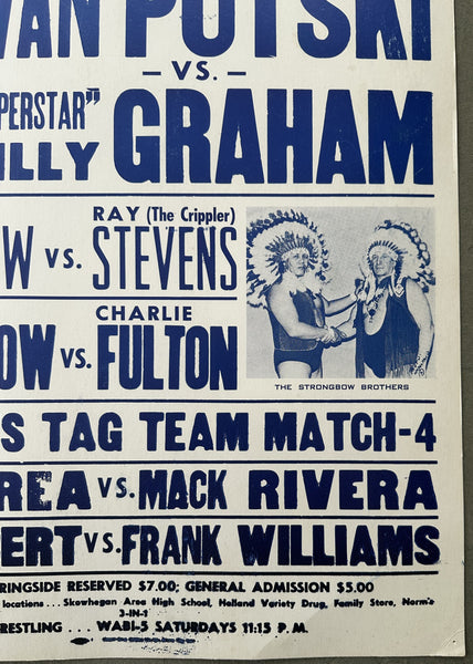 FULL DESCRIPTION: This is an original, cardboard, on site poster which names the wrestlers on the show and which pictures Ivan Putski and Chief Jay and Jules Strongbow. Bold color and print. Bold, clear images. Clean front and back. No center crease. Small corner tack holes. Very small crease in lower right corner. 17" x 26."