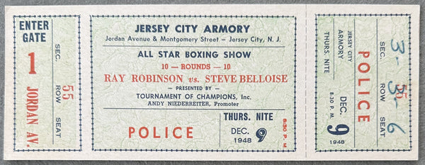 HISTORY: On December 9, 1948 at the Jersey City Armory in Jersey City, New Jersey Sugar Ray Robinson and Steve Belloise were scheduled to fight a ten round bout. An injury to Robinson forced a delay until August 24, 1949. Robinson knocked Belloie out in the 7th round.