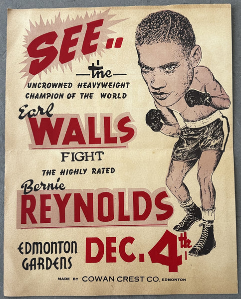 FULL DESCRIPTION: This is an original, heavy paper, on site poster which names the fighters and includes a graphic depiction of Earl Walls. Bold color and print. Bold, clear image. Mild toning, otherwise clean. Has a center crease. No tack holes. No tears. 11 1/4" x 14 1/4."