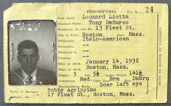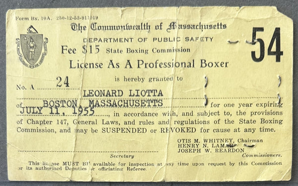 FULL DESCRIPTION: This is the original professional license of Tony DeMarco for the State of Massachusetts for the calendar year July 11, 1954 to July 11, 1955. This license was used by DeMarco for a number of fights including his victory over Jimmy Carter and his victory over Johnny Saxton to win the World Welterweight Title. The license is in DeMarco's birth name, Leonard Liotta and notes his ring name, Tony DeMarco. Includes a photo of DeMarco on the back. Bold color and print. Clean front and back. Creased. No tears. Edge and corner wear. 3" x 5."