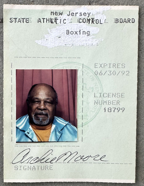FULL DESCRIPTION: This is the 1992 signed Boxing Trainer license of Archie Moore for the State of New Jersey. Signed at the bottom in ink, "Archie Moore." Includes a picture of Archie Moore. Not creased or torn. Some whiteout correction at top, otherwise clean. 3" x 4."