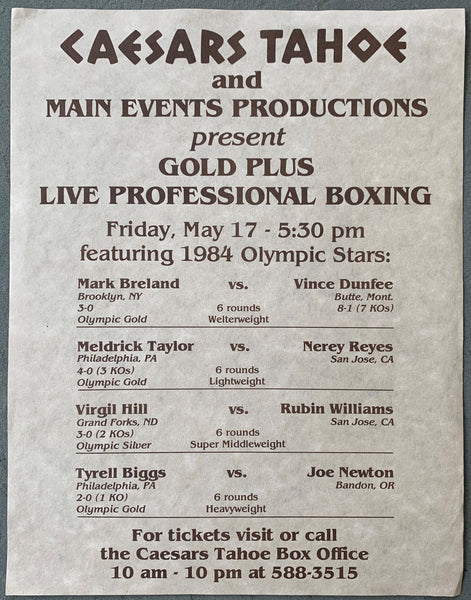 HISTORY: On May 17, 1985 at Caesars Tahoe in Stateline, Nevada future world champion Meldrick Taylor knocked out Nery Reyes in the first round in their lightweight bout. Welterweight Mark Breland knocked out Vince Dunfee in the 6th round. Heavyweight Tyrell Biggs stopped Grady Daniels in the 2nd round. Heavyweight Francisco Damiani stopped Larry Roberson in the first round.