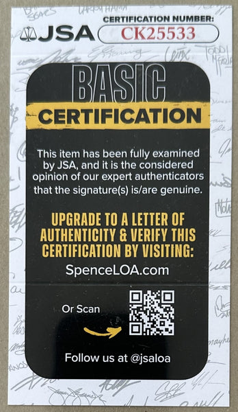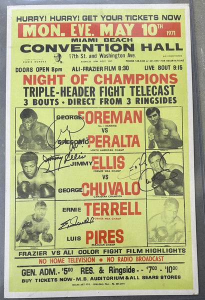 FULL DESCRIPTION: This is an original, cardboard, closed circuit poster which names and pictures all six fighters. Boldly signed in black sharpie by Foreman, Chuvalo, Ellis and Terrell. Bold color and print. Bold, clear images. Very small tack holes on perimeter. Not creased or torn. Minor corner wear. 14" x 22." Rare. Authenticated by JSA and comes with their label and cert numbered CK25533.