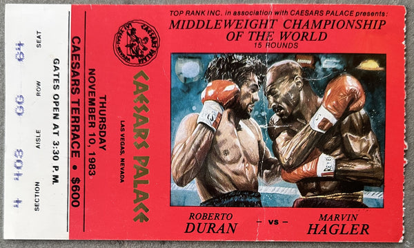 HISTORY: On November 10, 1983 at Caesars Palace in Las Vegas Marvin Hagler defended his Middleweight Title against former Lightweight and Welterweight Champion Roberto Duran. Hagler showed considerable respect for Duran's explosive power throughout the fight and won a 15 round decision.