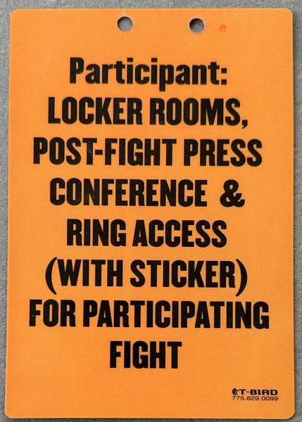 FULL DESCRIPTION: This is an original, Participant Credential which names and pictures both fighters. Bold color and print. Bold, clear image. Two holes atop for neck chain. Not creased or torn. Clean. 4 1/2" x 6 1/2."
