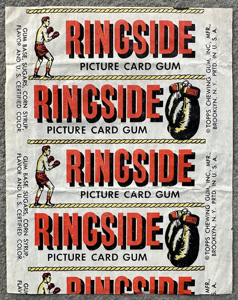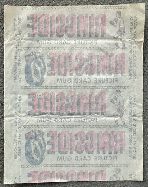 HISTORY & DESCRIPTION: This is an original 1951 Ringside Boxing Card wrapper. The wrapper is paper with the Ringside logo. Bold color and print. Clean front and back. Minor creasing. Minor edge wear. 4" x 5." A very nice example. Scarce.