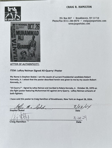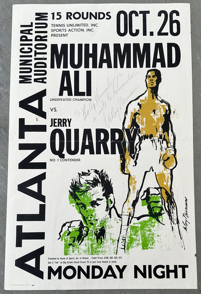 ALI, MUHAMMAD-JERRY QUARRY I SIGNED ON SITE POSTER (1970-SIGNED BY LEROY NEIMAN TO ROBERT KENNEDY, JR.-JSA)