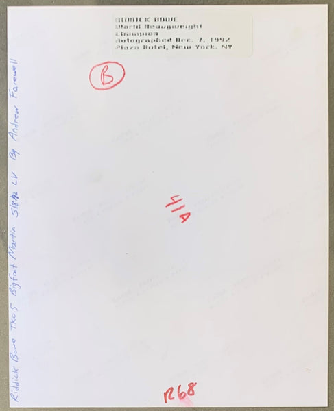 HISTORY: Riddick Bowe was born on August 10, 1967 in Brooklyn, N.Y. He won the World Heavyweight Title on November 13, 1992 from Evander Holyfield, winning by decision. He announced his retirement on April 20, 1997. Presented here is an original, first generation photograph of Riddick Bowe in action against Evererett "Big Foot" Martin on May 8, 1992 which Bowe won by TKo in round 5. On December 7, 1992 Bowe signed this photo at the Plaza Hotel in New York as noted on the reverse.