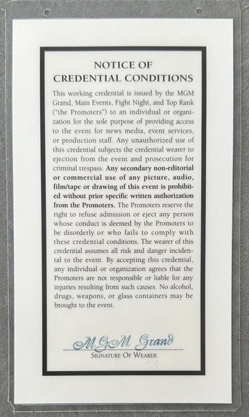 FULL DESCRIPTION: This is an original Press Credential which names the fighters and venue. Has a seat number.  Two holes atop for neck chain. Not creased or torn. Clean front and back. Bold color and print. 4 1/4" x 7 1/2."