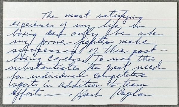 FULL DESCRIPTION: This is a white, unlined index card. Signed in ink on front, "From Your Pal, Hank Kaplan," and on the back, "The most satisfying experiences of my life in boxing can only be when my former fighters make successes of their post-boxing careers. To me this substantiates the great need for individual competitive sports in addition to team efforts-Hank Kaplan." Clean front and back. Not creased or torn. 3" x 5."