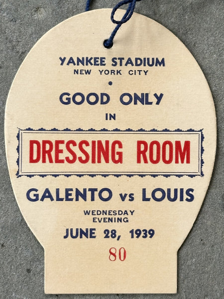 FULL DESCRIPTION: This is an original Dressing Room pass which names the fighters, date and venue and which is numbered. Bold color and print. One hole atop for wrist string which is present. Not creased or torn. Small amount of paper residue on the back from mounting. Irregularly shaped to 2 3/4" x 3 3/4."