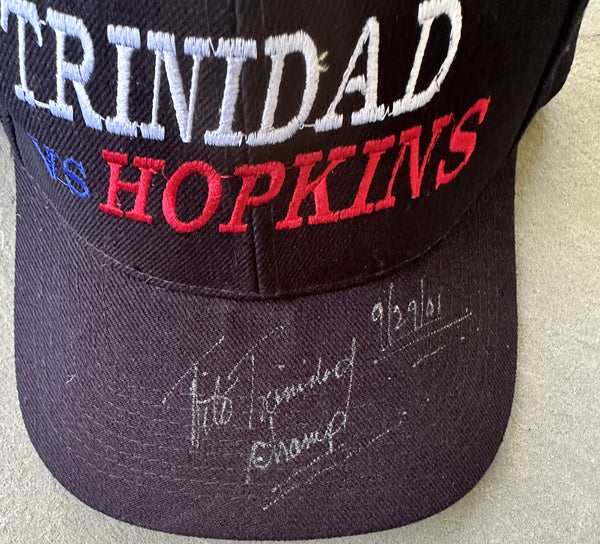 FULL DESCRIPTION: This s an original, souvenir hat for this event which has been signed by Felix "Tito" Trinidad. Signed on the front bill of hat in silver pen, "Tito Trinidad Champ 9/27/01." Unused. Clean with no noticeable flaws. One size fits all. From the collection of a NYPD Police Captain who obtained the signature in person.