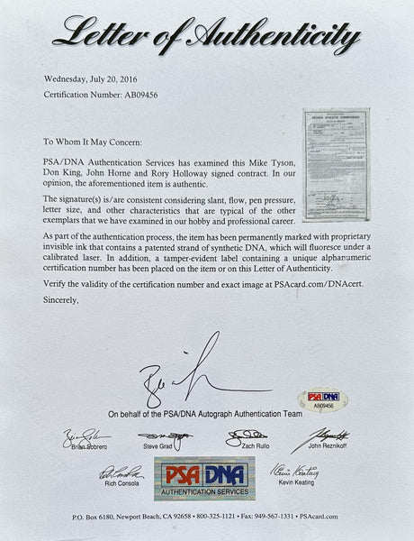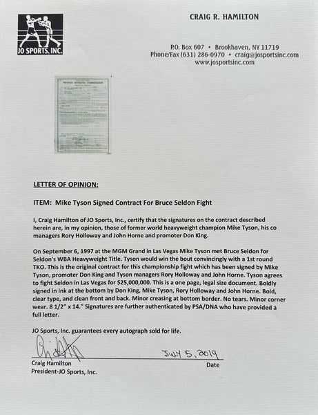 FULL DESCRIPTION: This is the original, Official Boxing Contract for this event which has been signed by Mike Tyson, his promoter Don King and his managers Rory Holloway and John Horne. A one page typed document signed in ink by all four. Not creased or torn. Minor edge wear. 8 1/2" x 14." Authenticated by PSA/DNA and by Craig Hamilton of JO Sports, Inc. and comes with full letters from both.