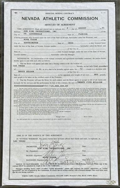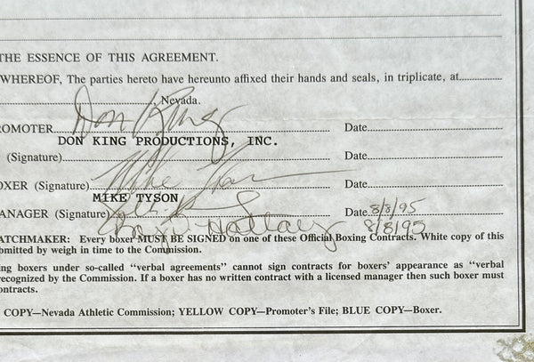 Offered here is the original Official Boxing Contract for this event which has been signed by Mike Tyson, his promoter Don King and his managers Rory Holloway and John Horne. Authenticated by PSA/DNA and by Craig Hamilton of JO Sports, Inc.