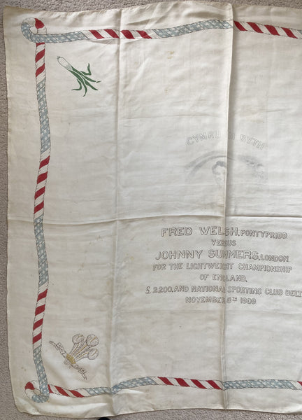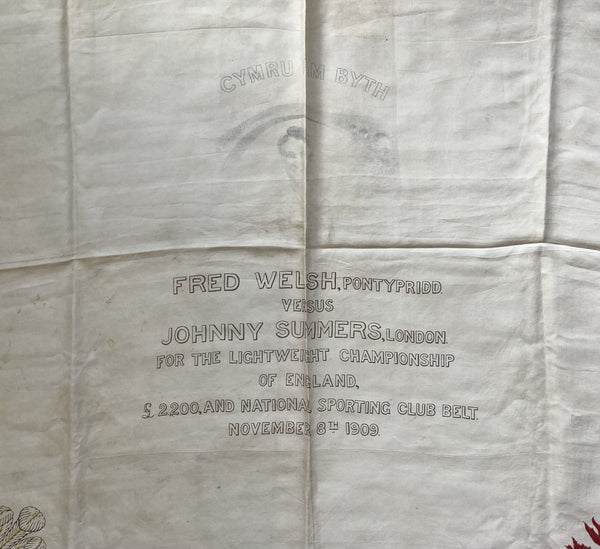 FULL DESCRIPTION: This is an original boxing silk which names the fighters and event and pictures Freddy Welsh. The print and colors remain bold with fading to the image of Welsh. Clean without staining, but has a bit of spotting from storage wear. No holes or pulls in the silk. 32" x 34."